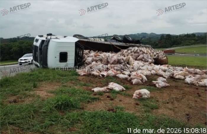 De acordo com informações registradas no local, o caminhão seguia pela faixa da direita quando o motorista perdeu o controle da direção por motivos ainda desconhecidos e o veículo acabou tombando na pista.