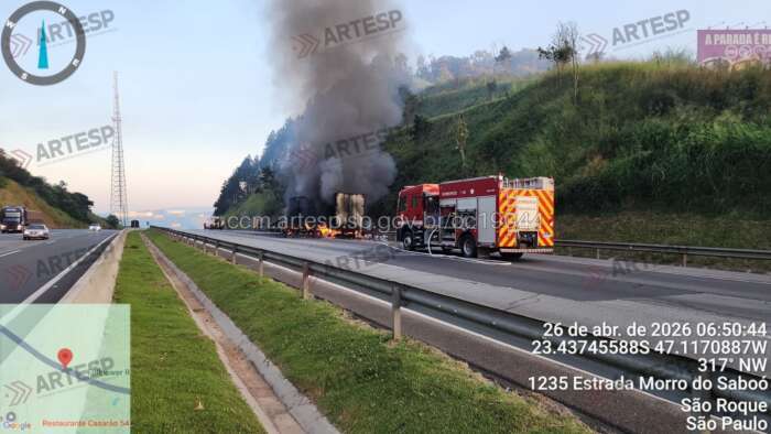 Uma carreta pegou fogo na manhã deste domingo (26) na Rodovia Castello Branco (SP-280), na altura do km 55, no município de Araçariguama, no sentido oeste.