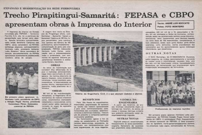 O jornalista André Luiz Boccato (Neco) assinou a reportagem “Trecho Pirapitingui–Samaritá: Fepasa e CBPO apresentam obras à imprensa do Interior”. Eu também vivi essa experiência, pela Rádio Universal de São Roque, na minha primeira viagem de trem.