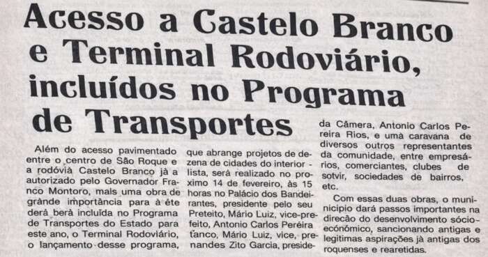 A construção do acesso de São Roque à Rodovia Castello Branco havia sido autorizada em 17 de dezembro de 1985. Já o Terminal Rodoviário tornou-se mais uma conquista da administração do prefeito Mário Luiz Campos de Oliveira, mesmo sem a definição de um local para a sua implantação.