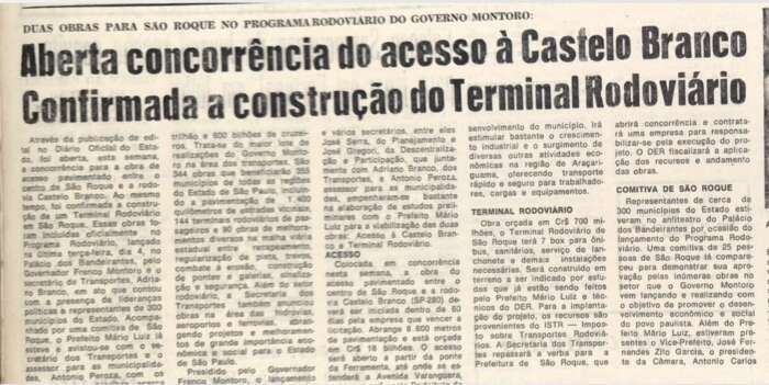 O Democrata, na edição de 1º de fevereiro de 1986, destacou em sua primeira página a manchete: “Acesso à Castello Branco e Terminal Rodoviário incluídos no Programa de Transportes”. O título antecipava a reunião com o governador Franco Montoro, marcada para o dia 4 daquele mês, quando seria anunciado o Programa de Transportes do Estado para o último ano de sua administração.