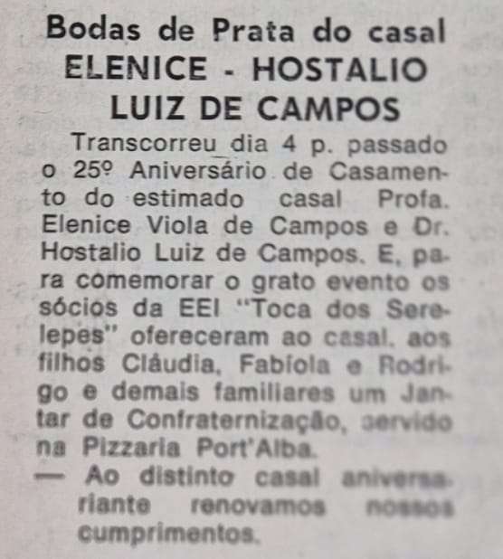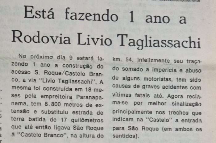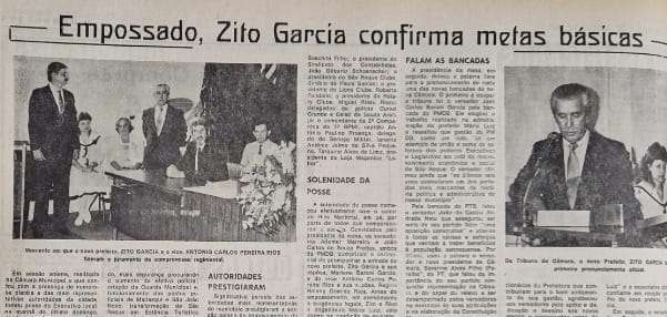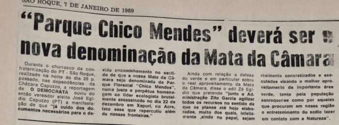 A posse do prefeito Zito Garcia (PMDB) e do vice-prefeito Antonio Carlos Pereira Rios (PMDB), em 1º de janeiro de 1989 no Jornal O Democrata (edição de 07/01/1989). O vereador reeleito Paulino Pereira (PDS), o mais bem votado (587 votos), presidiu a sessão solene. Zito Garcia destacou o trabalho do companheiro Mário Luiz (1983–1988) e prometeu a conclusão das marginais do Taboão (atual Avenida Aracaí) e Marmeleiro (Avenida Bernardino de Lucca), a continuidade da reforma da Brasital, a construção de um teatro municipal, creches, centros de saúde, criação da Guarda Municipal e a transformação de São Roque em estância turística. O vereador Severino Alves Filho (“Paraíba”, PT) assumiu a presidência da Câmara Municipal, tendo João Paulo de Oliveira (PTB, vice), Paulino Pereira (PDS, secretário), Celso Grande (PFL, segundo secretário) e Alfredo Estrada (PTB, tesoureiro)O vereador José Egydio Capuzzo (PT) assumiu decidido a denominar de “Parque Chico Mendes” a Mata da Câmara. “Uma justa e perpétua homenagem ao líder ecologista brutalmente assassinado no dia 22 de dezembro [de 1988], em Xapuri (AC), fato que repercutiu além de nossas fronteiras”. O projeto não avançou. Primeiro, porque a Lei Orgânica do Município (1987) determinava que a homenagem só poderia ocorrer após um ano da morte. Uma emenda de 2012 reduziu o prazo para seis mesesNa coluna social, destaque para o 25º aniversário de união do estimado casal professora Elenice Viola de Campos e o advogado. Hostálio Luiz de Campos. Para comemorar, os sócios da Escola de Educação Infantil Toca dos Serelepes (Rua Sotero de Souza, 414) ofereceram um jantar de confraternização na Pizzaria Port’Alba para o casal, os filhos Cláudia, Fabíola e Rodrigo e demais familiares. Dona Elenice está com 83 anos; Talico faleceu em 2004O ano começou com a posse da nova diretoria do Clube Atlético Paulistano para o biênio 1989/90. O comerciante Paulo Terrasan assumiu a presidência, tendo Irineu Pereira (“Irineu Enfermeiro”) como vice. A reportagem — de minha autoria — relembrou a história do clube, fundado em 28 de novembro de 1958, e destacou a expectativa para a disputa do Campeonato Paulista da Terceira DivisãoEm 9 de janeiro, um ano da inauguração Rodovia Lívio Tagliasacchi (acesso à Castello Branco) com um alerta para o número de acidentes. “Infelizmente, o traçado, somado à imperícia e ao abuso de alguns motoristas, tem causado graves acidentes com vítimas fatais.” Reclamava-se por melhor sinalização, especialmente nos trechos da Rodovia Castello Branco que indicam a entrada para São Roque em ambos os sentidos