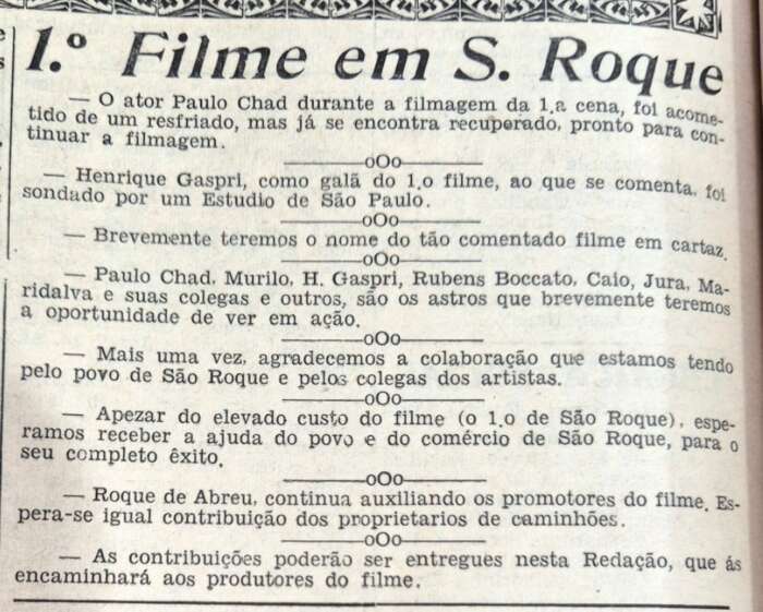 Paulo Chad (no papel de bandido) “acometido de um resfriado durante a primeira gravação”; e o galã Henrique Gaspari, “ao que se comenta, sondado por um estúdio em São Paulo”. O Democrata, 26/10/1960