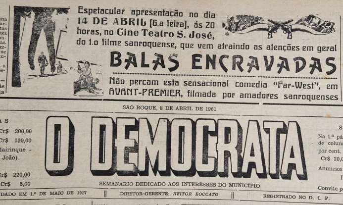 Anúncio da estreia do filme “Balas Encravadas”, em 14 de abril de 1961. O Democrata, 08/04/1961