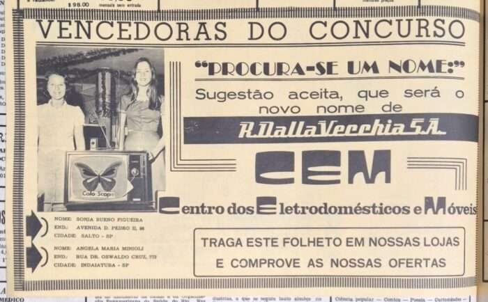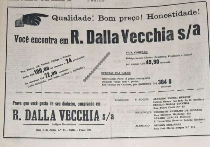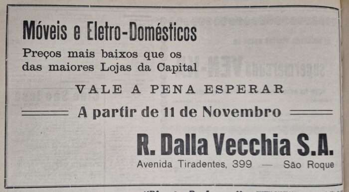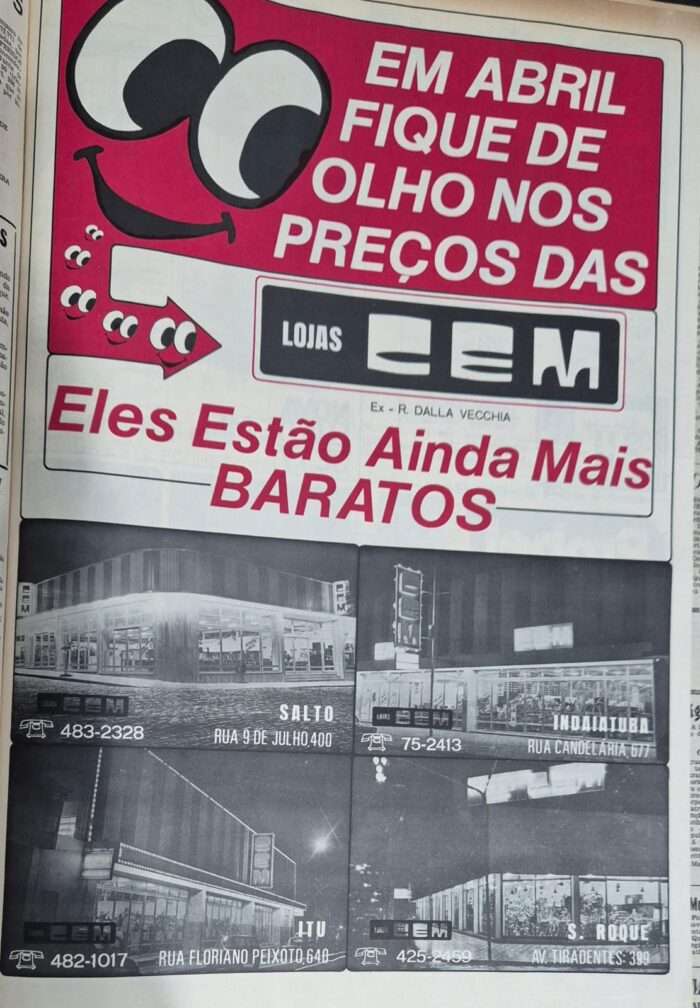 O Arquivo Vivo do Jornal O Democrata resgata a inauguração da R. Dalla Vecchia em São Roque, as primeiras publicidades e a mudança do nome para Lojas Cem. Uma história que começa antes mesmo da construção do prédio próprio na Avenida Tiradentes, 399. Era um tempo em que vendedores percorriam as casas da região oferecendo produtos por meio de catálogo.