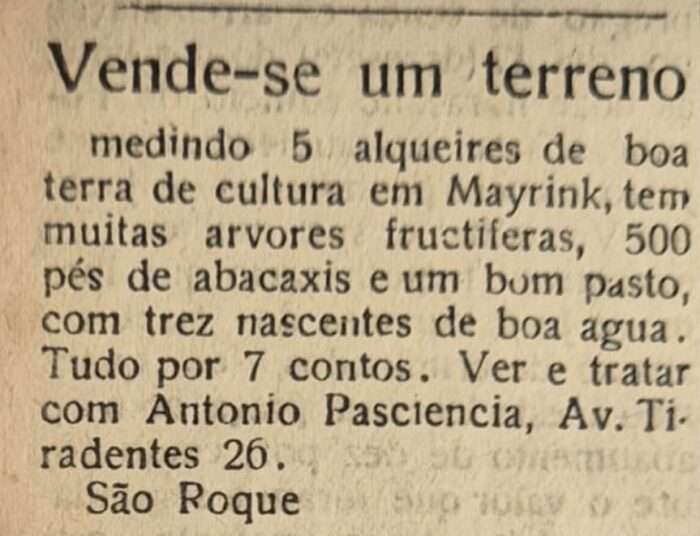 Em 1925, um terreno de 5 alqueires de boa terra de cultura em Mayrink, com 500 pés de abacaxi, bom pasto e três nascentes de água, estava à venda por 7 contos de réis (plural de “real”, moeda oficial do Brasil da colonização até 5 de outubro de 1942).