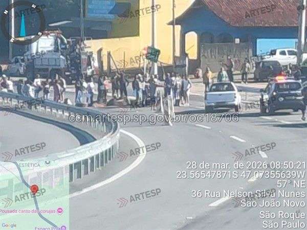 Uma manifestação interditou totalmente a Rodovia Raposo Tavares (SP-270), na altura do km 54, em São Roque (SP), no sentido oeste, neste sábado (28).