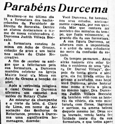 Na edição de 27 de dezembro de 1975, o jornal O Democrata registrou a formatura dos bacharéis da Faculdade de Direito de Sorocaba. “Dentre os alunos, destacamos o nome de nossa colaboradora Durcema Judith Villaça Boccato”, esposa de Osmar de Castro Boccato (professor, ex-vereador e diretor de O Democrata). Mãe de três filhos, Antonio, Durval e Maíque (Osmar Henrique), Durcema tornou-se advogada aos 45 anos. “Minha mãe fez a faculdade para me incentivar a seguir o mesmo caminho e conseguiu”, lembra Maíque, atual vice-prefeito de São Roque. Durcema não se limitou aos estudos, passou a exercer a profissão. Também foi inspiração para que sua nora, Sandra, cursasse Jornalismo e Direito.