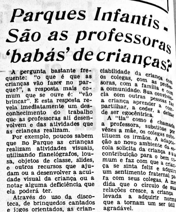 Algumas semanas depois (edição de 24 de janeiro de 1976), a professora Gema Francisca Mazetto Alonso levantava a questão: “Parques Infantis: são as professoras ‘babás’ de crianças?” E emendava outra pergunta: “O que é que as crianças vão fazer no parque?”