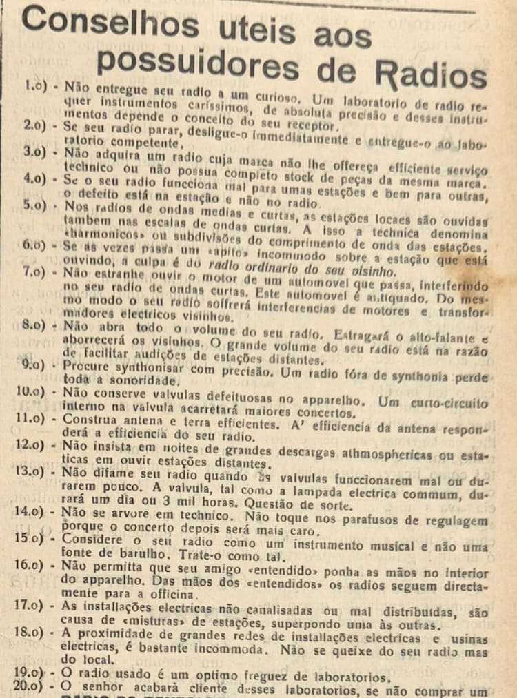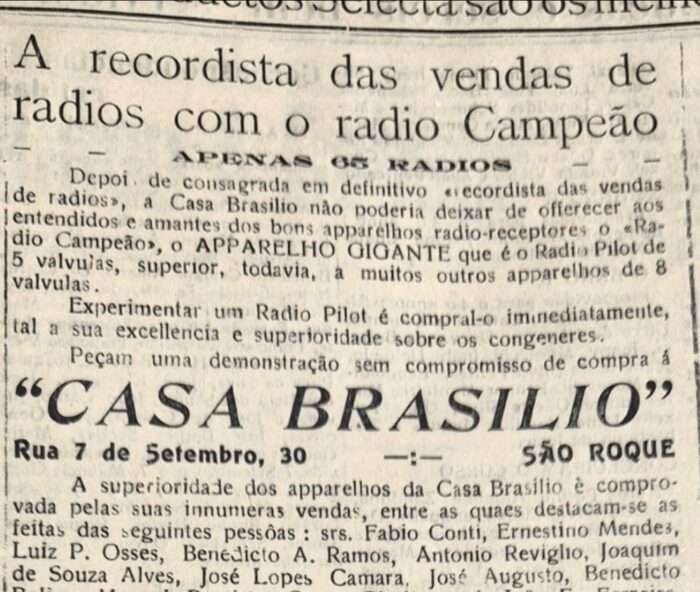 Falando em origem, o italiano Guglielmo Marconi (1874–1937) é considerado o “Pai do Rádio”, mas há uma disputa pelo reconhecimento do padre brasileiro Roberto Landell de Moura (1861–1928), que teria realizado a primeira transmissão em 1894, dois anos antes do físico italiano. O gaúcho Landell patenteou o invento no Brasil e nos Estados Unidos, mas, sem dinheiro e sem apoio para dar continuidade ao projeto, foi chamado de louco e bruxo. Sem perder o foco da nossa coluna, o Arquivo Vivo resgata publicações que ilustram a época de ouro do rádio e a disputa do comércio de São Roque na venda dos aparelhos, oferecendo orientações técnicas e divulgando o nome dos compradores de umproduto cobiçado e caro. Só mais duas coisas [eu não aguento] … O locutor Romeu Tuma fez palestra em São Roque e Marconi foi homenageado, em São Roque, com o nome de um clube fundado pela colônia italiana.