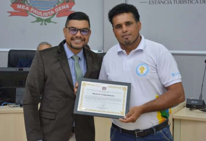 A homenagem ocorreu durante a 43ª Sessão Ordinária da Câmara Municipal, realizada na manhã de terça-feira, dia 09, ocasião em que Paulinho da Sabesp recebeu a Moção de Congratulações nº 381/2025, entregue pelo parlamentar.