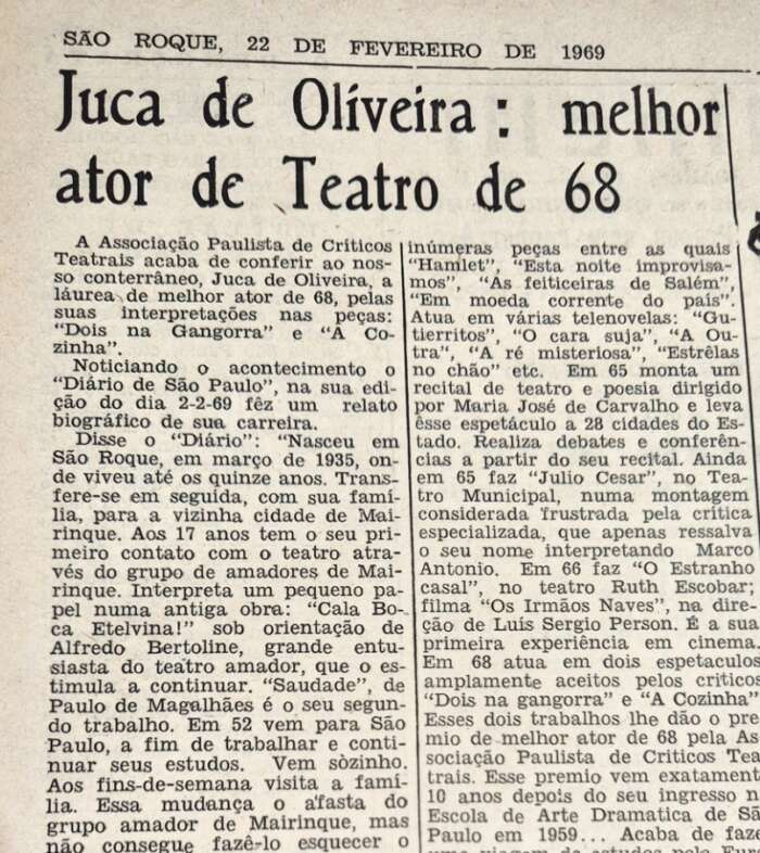 Em 2012, Juca esteve em São Roque em um evento da concessionária CCR ViaOeste, no Recanto da Cascata, em um projeto com estudantes. Tive a oportunidade de entrevistá-lo, quando falou das primeiras apresentações no grupo de teatro de Alfredo Bertolini, em Mairinque. “O Democrata fez uma crítica dessa peça que eu guardei o recorte e coloquei em um quadro na minha galeria, na minha fazenda em Itapira. Naturalmente, eu me chamava José de Oliveira Santos, eu não era o Juca de Oliveira. Faz uma menção à minha interpretação. Mas dali eu não poderia supor que o teatro entraria na minha vida.” Não localizei ainda essas duas notícias no centenário arquivo do Jornal O Democrata. Fica, talvez, para uma futura coluna — não estou prometendo.